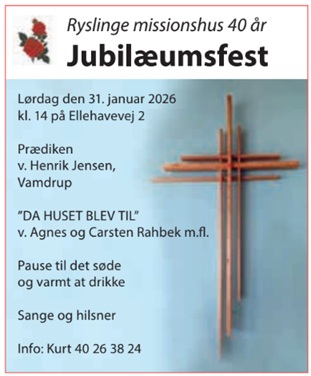 Lørdag den 31. januar 2026 inviteres til 40 års jubilæumsfest i Ryslinge missionshus.